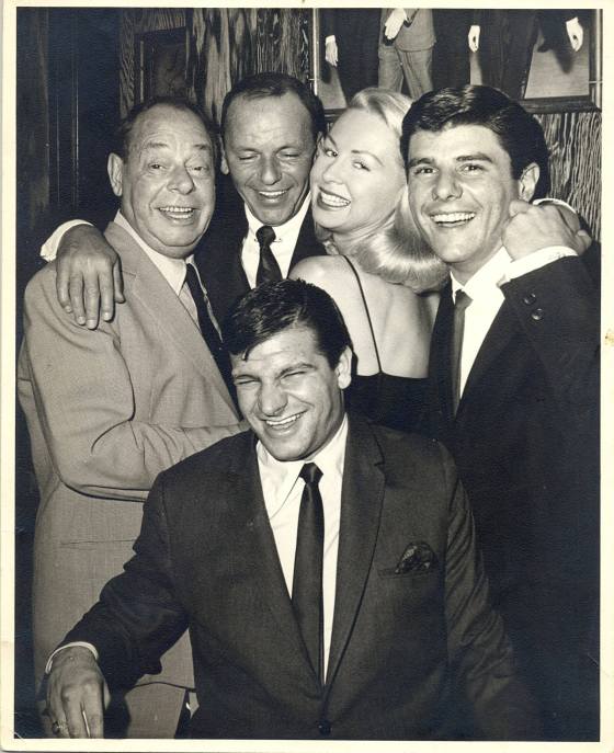 Joe E. Lewis (left), Sinatra, Shecky Green (front), Frankie Randall, and a very lucky gal.